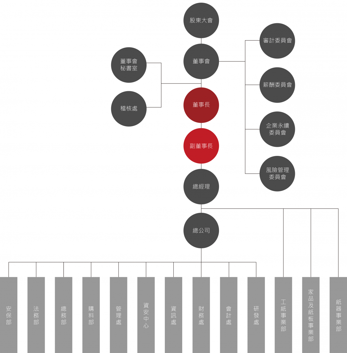 總公司設有管理處、資訊處、財務處、會計處、研發處,並於董事會下設稽核處,是全公司品質、產銷、行政、技術及全球運籌與子公司治理等業務管理中心。