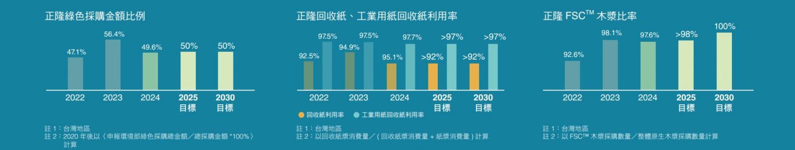 在資源循環方面,2024年正隆於台灣再生利用回收紙總量達166萬公噸,所有紙種及工業用紙的回收紙利用率分別達95.1%(+0.2% YoY)與97.7%(+0.2% YoY),持續精進資源的回收與再利用;海外部分,2024年越南平陽造紙廠共再生使用69萬公噸的回收紙,年增率16%,工業用紙回收紙利用率95.1%,總計全集團再生使用235萬公噸的回收紙,創造資源再生循環再生效益。為深化循環經濟並落實廢棄物減量,公司積極提升綠色採購比例,並設定2030年綠色採購金額占比達50%的長期目標。2024年,正隆綠色採購金額達85.2億元,占總採購金額49.6%(-6.8% YoY),比率下降主係因應市場趨勢調整,減少原生木漿採購量,進而影響綠色採購金額。然而,正隆整體綠色採購績效仍保持業界領先,未來將持續深化低碳採購策略,強化永續供應鏈發展,以實現企業與環境共榮。