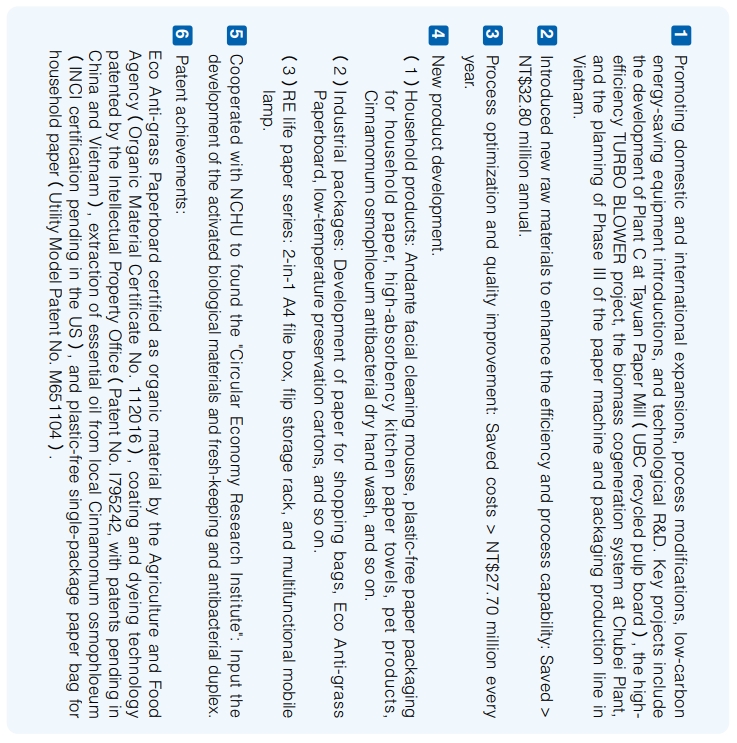 To tackle the problem of waste food paper container disposal, we also believe that it is responsible for papermakers' responsibility to engage in recycling waste food paper containers. Therefore, we made advanced deployment by investing a “efficient film laminated paper treatment system” in 2018 to become the 1st company completely recycling food paper containers. In same year, started the “upgrading of recovered paper supply chain plan” and deepen the benefits of the circular economy. We supported over 167 recovered paper suppliers in Taiwan to upgrade. Reduced paper sludge by 50% and decreased the energy consumption by 10% by implementing source identification, and enhanced the profit and competitiveness of recovered paper supply chain. The plastic laminate is recycled into green fuel and eco-friendly building materials products. Pre-planned to help solve the growth of the take-out catering culture was driven by the epidemic and respond to the stop using plastic bottles policy in Taipei in 2022 to realize benefits with a creative multi-win sustainability business model. With the goal of continuously deepening the recycling efficiency, the recycled bleached pulp line of Tayuan Mill, which will operate in 2023H1.