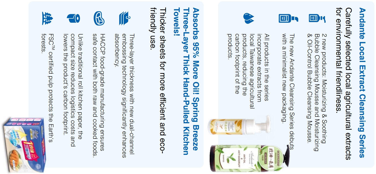Through constant process optimization, introduction of new technology and advanced equipment, including Taiwan’s 1st automated household tissue warehouse, Asia’s 1st millions Mt wind turbine, and enhance the R&D center to develop high-value and low carbon products to meet increasing consumer demand. In line with the global trend towards low-carbon and plastic reduction solutions rooted in nature, we developed the "SILLACE Andante Paper Packaged Facial Tissue" in 2023. Additionally, we launched products such as the "Dandelion Eco-Friendly Convenient Pack Tissue" and the "Andante Local Extract Facial Cleansing Series," offering diverse ways to help consumers easily practice environmental protection in their daily lives.