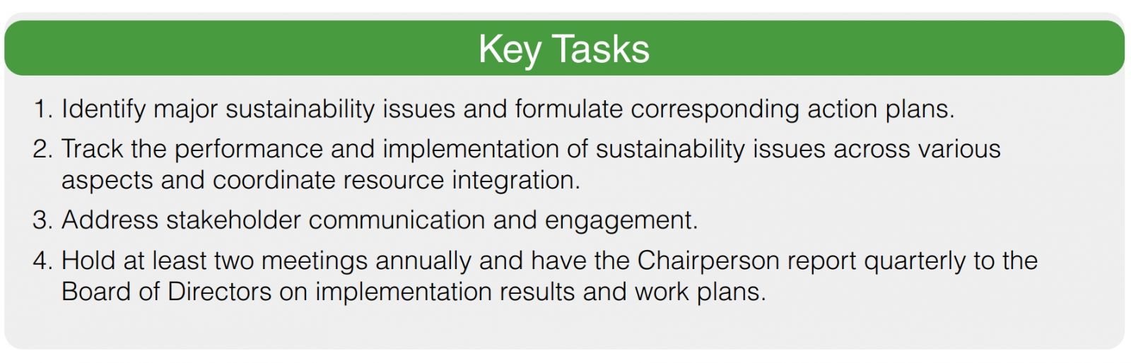 Sustainable Development Governance StructureThe CLC Board of Directors serves as the highest decision-making and supervisory body for sustainable development, annually reviewing sustainability project progress, management policies, and execution through reports from the sustainability committee and its executive secretary. The sustainability committee oversees 7 taskforces: Corporate Governance and Integrity, Environmental Sustainability, Employee Care, Supply Chain Management, Industry Services, Social Inclusion, and Information Security. Each taskforce comprises first-level supervisors and senior staff from relevant departments, with ESG responsibilities assigned by function and extended to subsidiaries. The committee established the Climate Change and Circular Economy Office, led by the President and the R&D supervisor as deputy, and consults external experts, including the Taiwan Green Productivity Foundation. The taskforces hold monthly meetings to track progress and effectiveness, reporting quarterly to the Board. The Board arranges annual corporate sustainability training for directors.