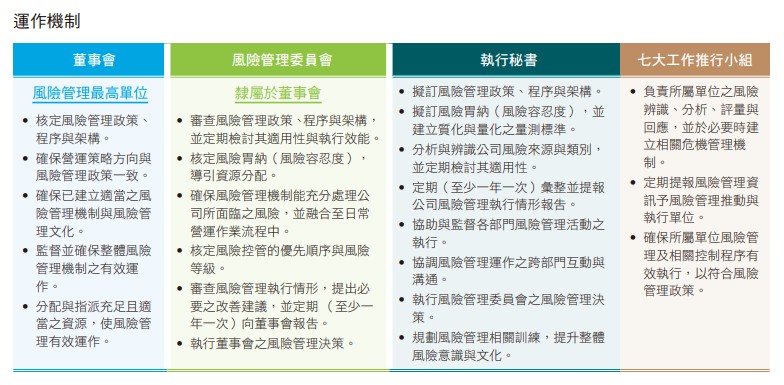 ● 策略:營造重視風險管理之經營策略與企業文化,強化風險管理作業以提升營運透明度及保障員工、股東之權益。