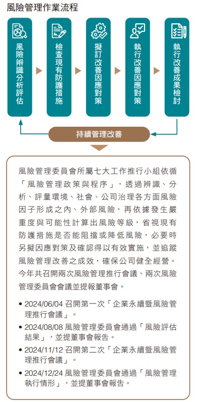 執行風險管理制度與運作是確保正隆穩定營運的重要根基。為完善風險管理制度,正隆成立直屬董事會之「風險管理委員會」,所屬七大工作推行小組依循「風險管理政策與程序 」,透過辨識、分析、評量環境、社會、公司治理各方面風險因子形成之內、外部風險,再依據發生嚴重度與可能性計算出風險等級,省視現有防護措施是否能阻擋或降低風險,必要時另擬因應對策及確認得以有效實施,並追蹤風險管理改善之成效,確保公司健全經營,風險評估之邊界主要以合併公司為主,包含台灣、中國大陸、越南既有營業據點。2024年共召開兩次風險管理委員會會議並提報董事會。